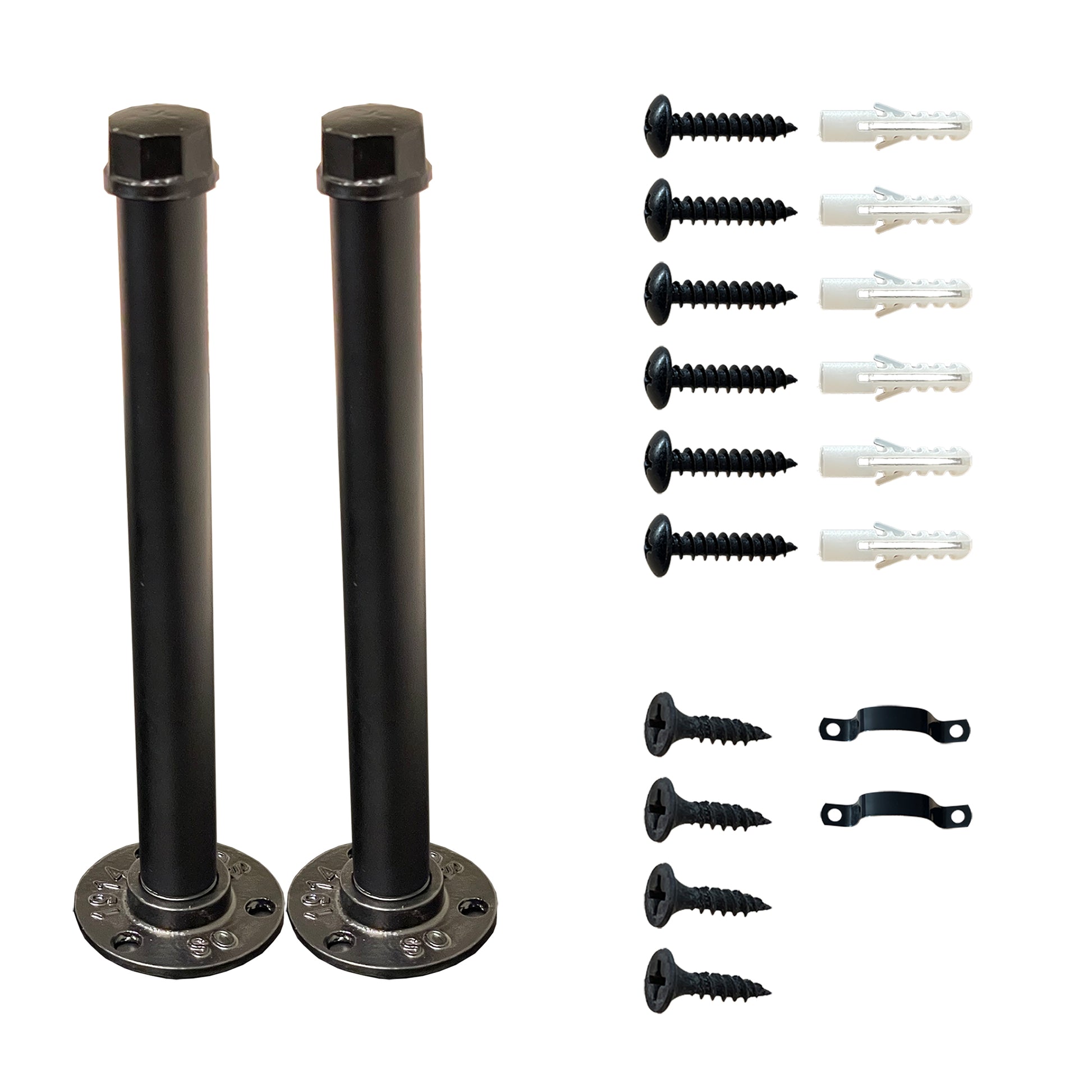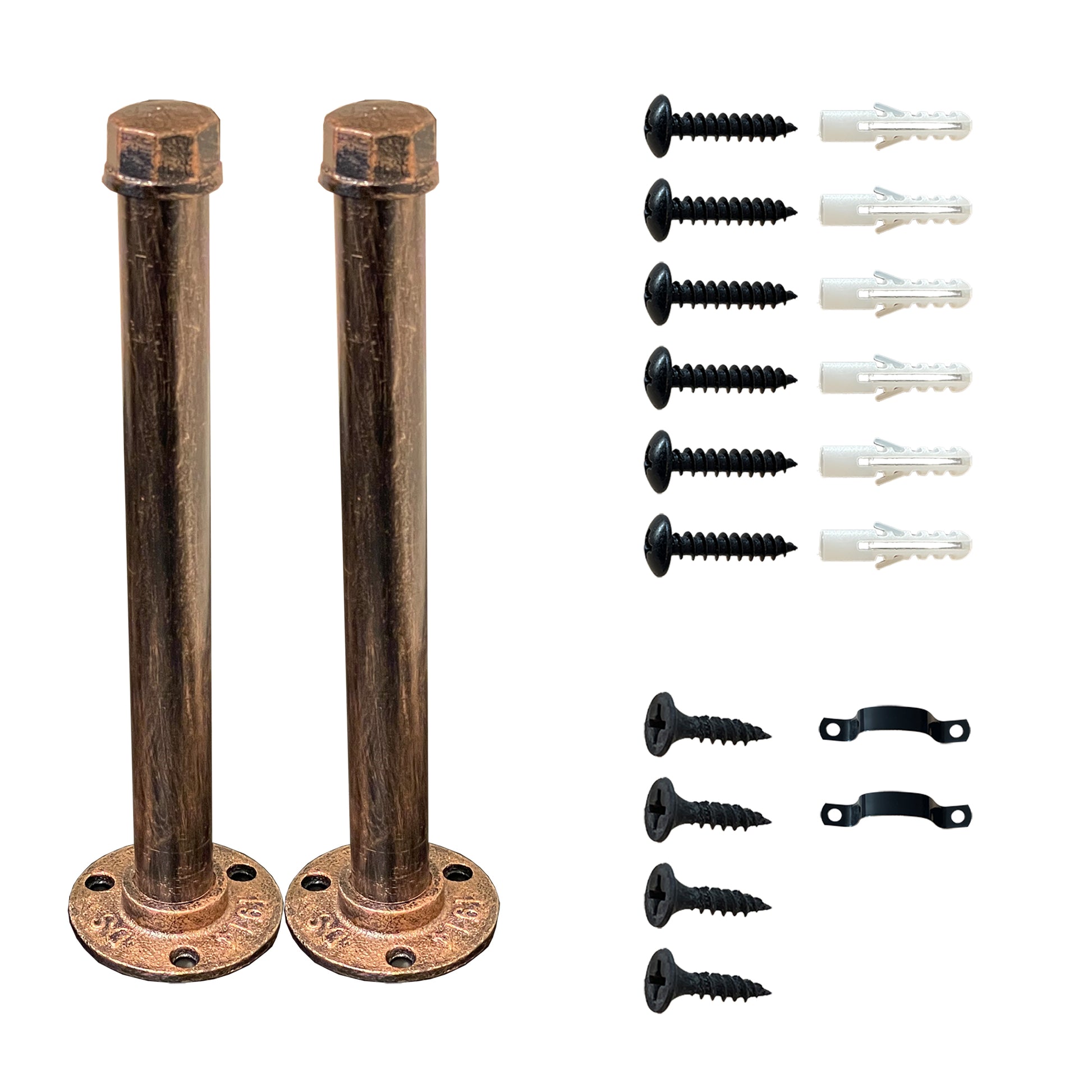Rustic Iron Pipe Shelf Brackets Perfect for shelves of all types, in any room of the house or business! Brackets comes in Black, Gold, Antique Brass and Antique Copper Each set includes:2 Pipe brackets(including flange, pipe and cap) Mounting hardware (including anchors and mounting screws)
